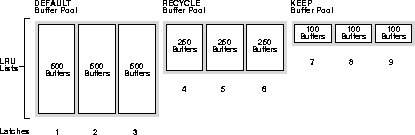 RU Latches with Multiple Buffer Pools: Example 2The DEFAULT buffer pool has 500 buffers for each LRU list. The RECYCLE buffer pool has 250 buffers for each LRU list. The KEEP buffer pool has 100 buffers for each LRU list.