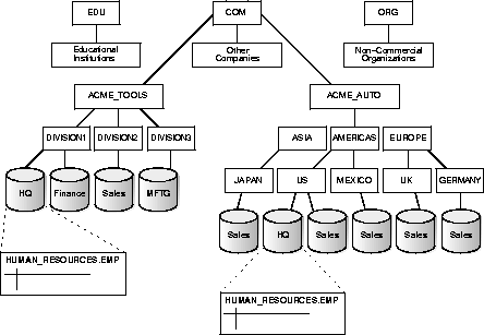 Each database in a distributed database is distinct from all other databases in the system and has its own global database name. Oracle forms a database's global database name by prefixing the database's network domain with the individual database's name. For example, Figure 1-2 illustrates a representative hierarchical arrangement of databases throughout a network.
