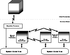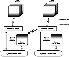 The second configuration uses shared servers on the remote server. This configuration eliminates the need for more dedicated servers, but requires to go through the dispatcher on the remote server. See Figure 2-2. Note that both the local and the remote server must be configured as multi-threaded servers.