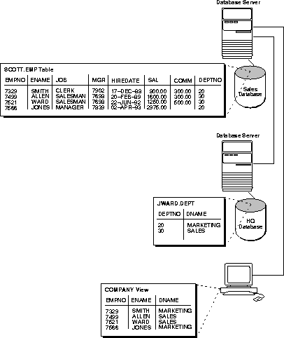 For example, assume that table EMP is stored in a local database. Another table, DEPT, is stored in a remote database.