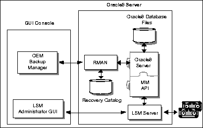 You use LSM to configure and manage the storage devices connected to the Oracle Server as well as the storage volumes used in those devices. LSM stores the backup data passed from the Oracle Server's backup/restore utility on storage volumes mounted in the devices. During Oracle data recovery, LSM retrieves the backed-up Oracle data from the appropriate storage volumes and passes it to the Oracle utility.