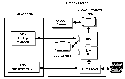 In providing storage management services for Oracle7 Server data, LSM uses the Oracle Media Management (MM) Application Programming Interface (API). LSM interacts with the Oracle7 EBU through the MM API.