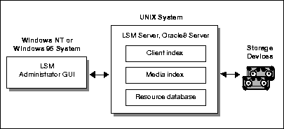 In Figure 1-1, the LSM Server has been installed on a UNIX system with the Oracle8 Server, and the LSM Administrator GUI has been installed on a separate Windows NT or Windows 95 system on the network. The LSM Administrator GUI connects to the LSM Server over the network. The LSM Server uses the two online index files shown-the client index and media index-to store information about the Oracle backups. It uses this information to manage the life cycle of the Oracle backup data and enables LSM users to browse this index information.