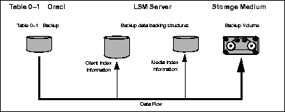 Figure 2-2 illustrates a simplified model for the Oracle backup operation using LSM. As explained in the section "Overview of Oracle Backup and Recovery System" in Chapter 1, Oracle Server processes create the Oracle data backup sets during the backup operation. These backup sets are passed to the LSM Server, which writes the Oracle data to backup volumes in the storage devices. The LSM Server also tracks the location and status of the backup data on the storage volumes.