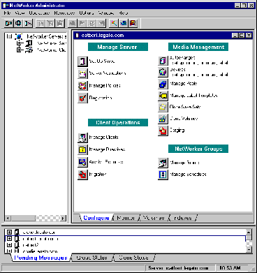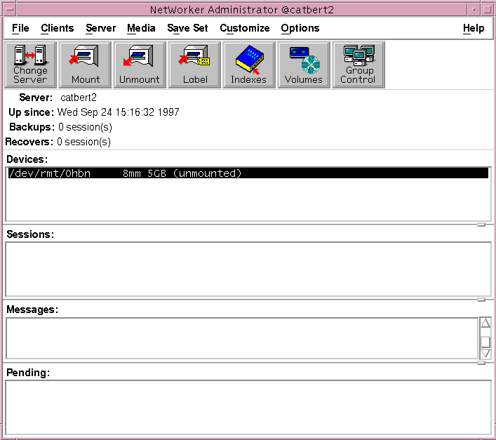 The main window of the nwadmin graphical user interface display provides status information similar to that provided by the nsrwatch program for character-based displays.