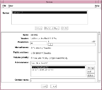 If you do not specify a server-name with the -s command option, the nwadmin command uses the server selection rules described in the nsr(1m) man page. When multiple LSM servers are accessible, you can select them from within the graphical user interface; simply click the Change Servers speedbar button and enter the host ID of the server you want to access.