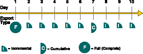 A complete export was taken on Day 1, a cumulative export was taken every week, and incremental exports were taken daily.