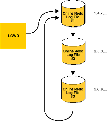 LGWR writes to online redo log files in a circular fashion; when the current online redo log file is filled, LGWR begins writing to the next available online redo log file. When the last available online redo log file is filled, LGWR returns to the first online redo log file and writes to it, starting the cycle again. Figure 2-1 illustrates the circular writing of the online redo log file. The numbers next to each line indicate the sequence in which LGWR writes to each online redo log file.