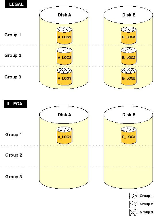 To safeguard against a single point of online redo log failure, a multiplexed online redo log should be completely symmetrical: all groups of the online redo log should have the same number of members. However, Oracle does not require that a multiplexed online redo log be symmetrical. For example, one group can have only one member, while other groups can have two members. Oracle allows this behavior to provide for situations that temporarily affect some online redo log members but leave others unaffected (for example, a disk failure). The only requirement for an instance's online redo log, multiplexed or non-multiplexed, is that it be comprised of at least two groups. Figure 2-3 shows a legal and illegal multiplexed online redo log configuration. The second configuration is illegal because it has only one group.